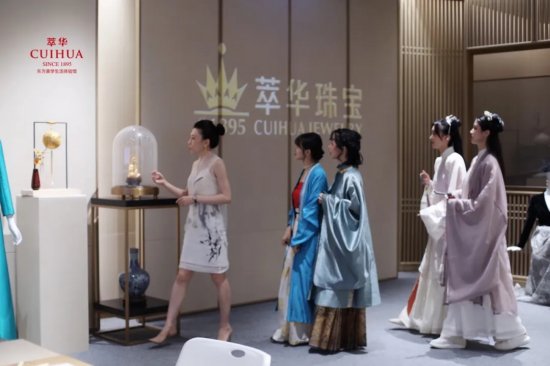 汉服小姐姐们在领略中华文化之美的同时,还有幸将非遗花丝工艺精品佩戴在身进行体验。