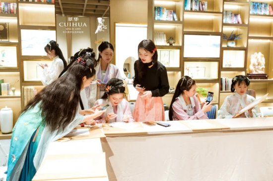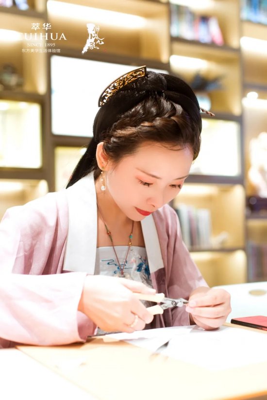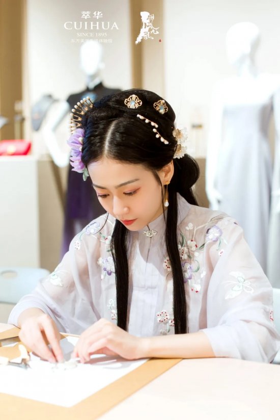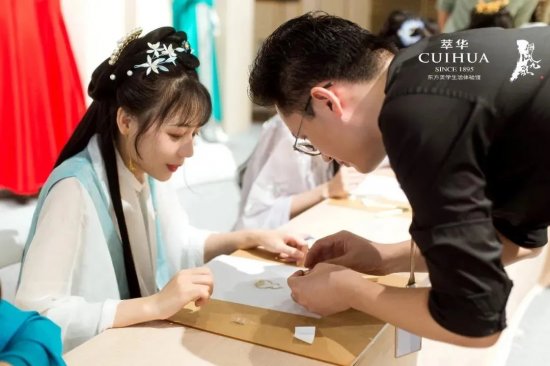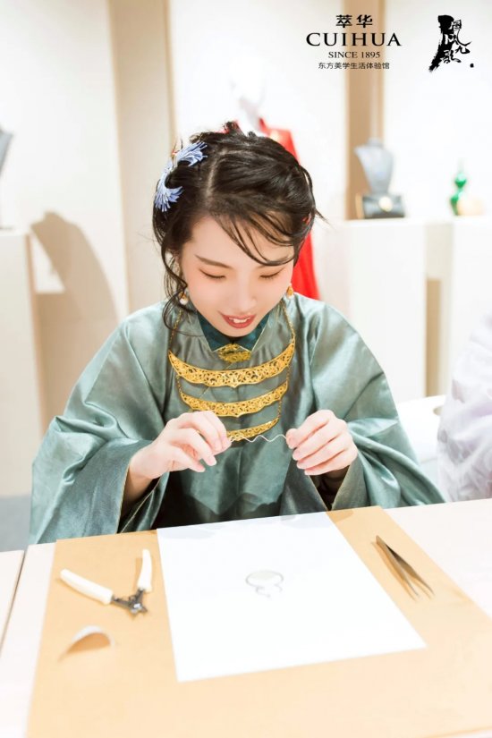 在萃华·东方美学生活体验馆的非遗花丝工艺公开课上,汉服小姐姐们用花丝编织自己的信物,或成为寄托情感的至宝,或将成为自己传世的工艺大作。