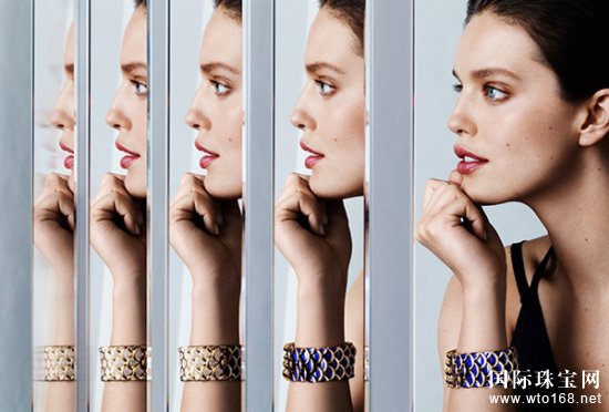 正面,铺镶钻石的连续图案在腕间闪耀光芒;背面,夜空般深邃的青金石与玫瑰金和钻石相互映衬。只需将手腕轻轻翻转,这枚灵活柔软的手镯瞬时从白昼化为夜晚,从温暖色泽化为沉静暗影。